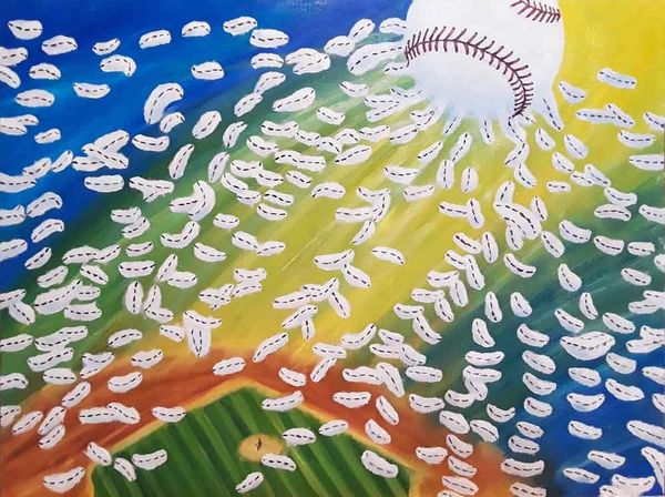 The hands on, somewhat painstaking experience of painting every one of those baseball atoms each with a shadow and life of its own was deeply immersive. These “baseball atoms” are little pieces that make up a whole encompassing everything about baseball to me: peanut hawkers, shells beneath the seats, beer, the leather getting whacked off the ball from a single or double, and the soaring feeling watching a homerun (moon shot) go out of the park.